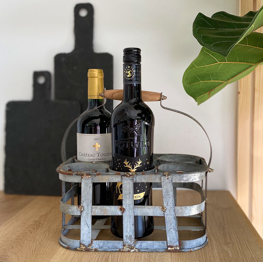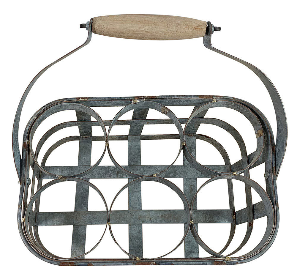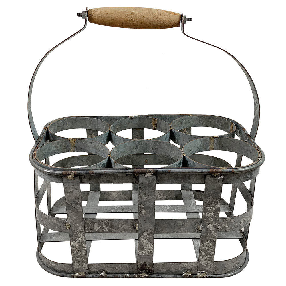 Dieser altertümliche Flaschenträger aus Zink ist ein außergewöhnlicher, nostalgischer Blickfang und ist ideal für 6 Flaschen.