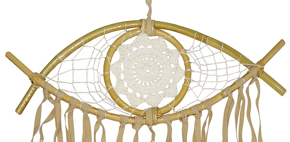 - Der Traumfänger wurde in Form eines Auges aus Bambus gefertigt und wunderschön verziert.