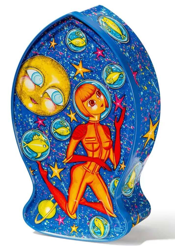 Dieses wunderschönen Geschenkset in einer Metallbox Form in Form einer Sardine ist kunstvoll gestaltet. Lulu schwimmt in einem Raumanzug in einem Meer mit Mond und Sternen und natürlich auch mit kuriosen Fischen, die von Coralie Joulin entworfen wurden.
