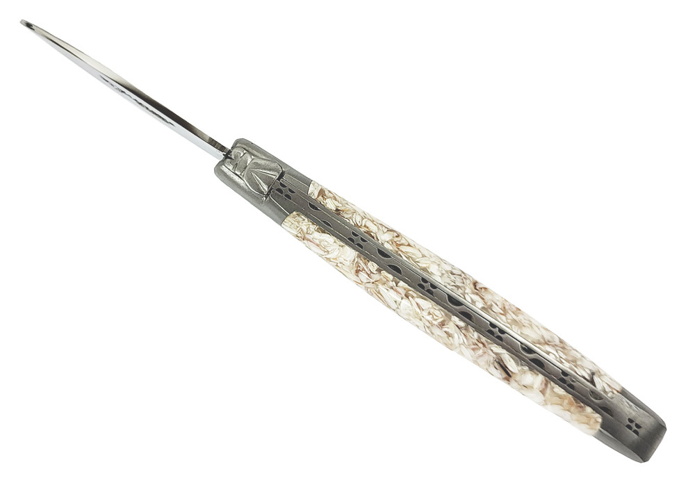 Der Griff ist aus zerkleinerten Jakobsmuschelschalen gefertigt und liegt sehr angenehm in der Hand.
