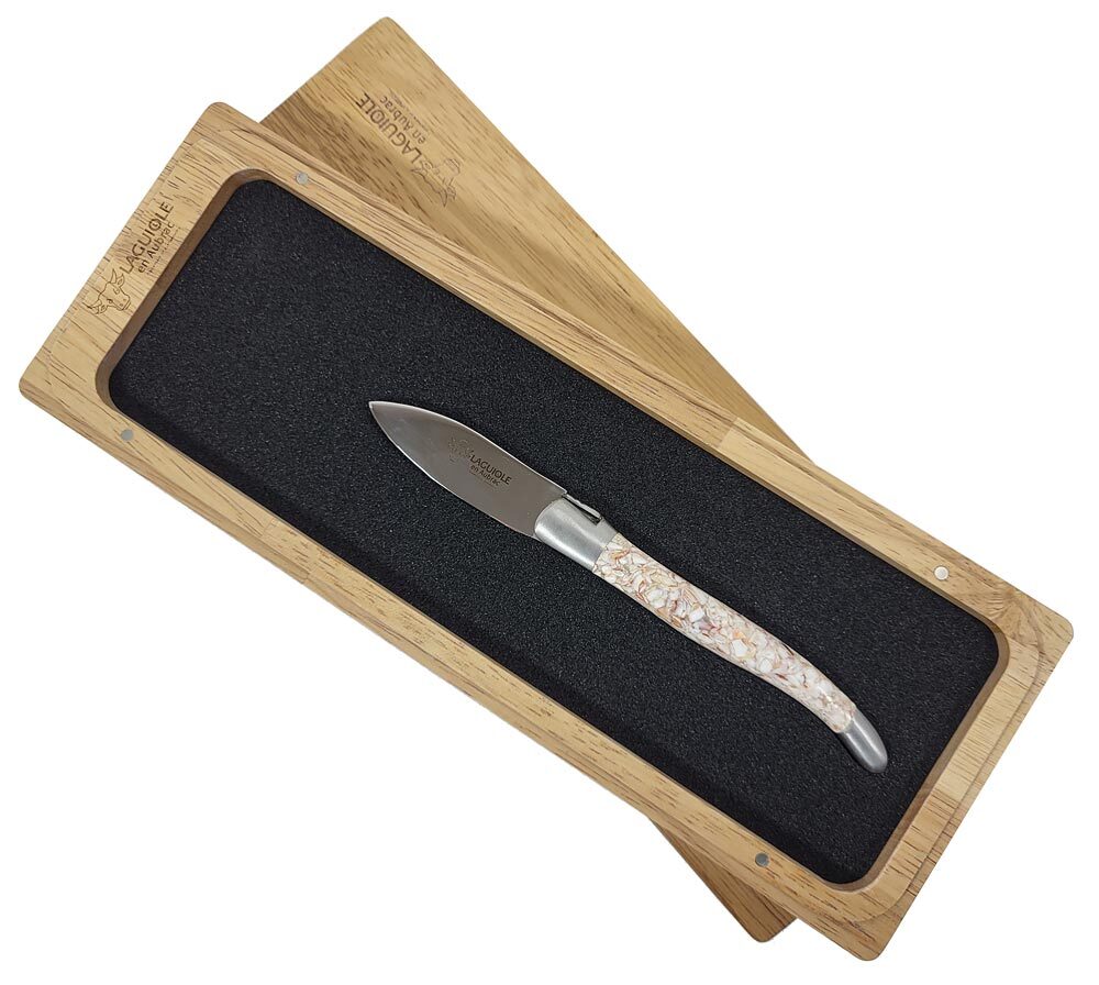 Ausgezeichnet als "bestes Austernmesser" weltweit, stammt dieses Messer direkt aus der Traditions-Schmiede von Laguiole. Die Griffschalen sind, ganz stilecht, aus zerkleinerten Jakobsmuschel-Schalen gefertigt. Die perfekt geformte Klinge aus Edelstahl eignet sich hervorragend für die sogenannte französische, also seitliche, Technik der Austernöffnung.