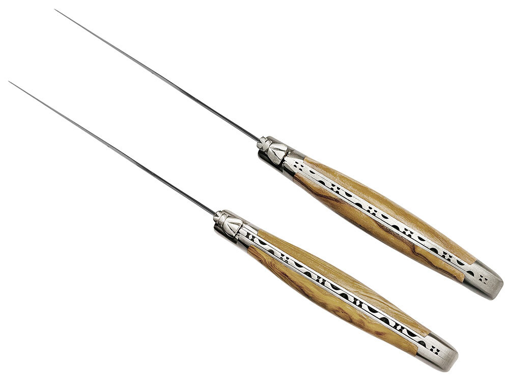 Laguiole en Aubrac 2-teiliges Steakmesser Set in dekorativem Holzkasten - Bei diesen klassischen Laguiole Messern sind die Griffschalen aus mediterranem Olivenholz gefertigt und haben eine besonders schöne, warme Farbgebung.