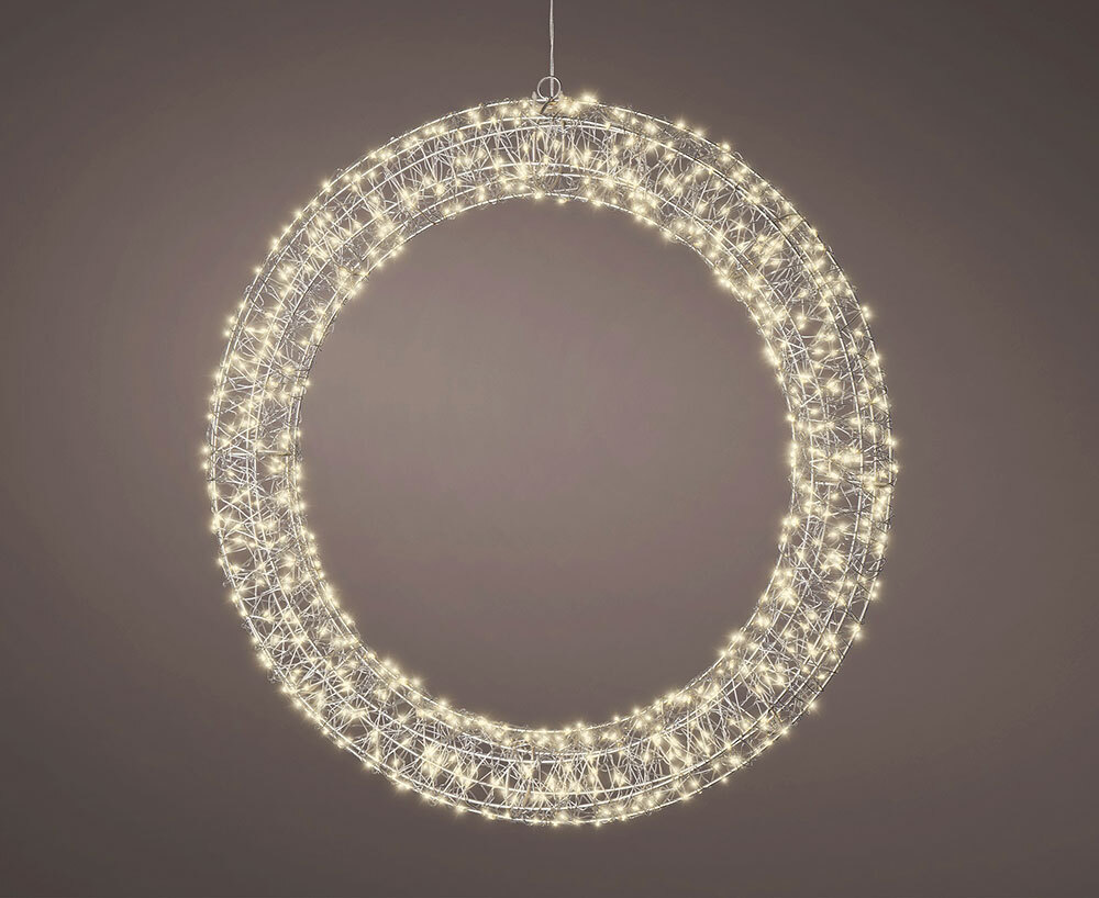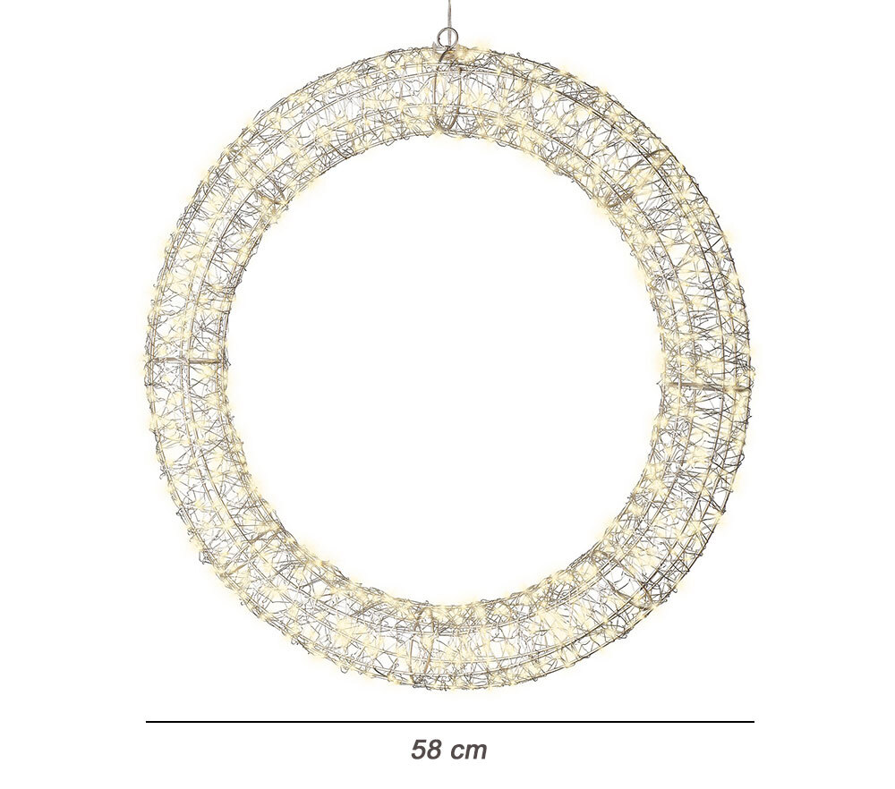 - Durchmesser/Tiefe: 58 x 6 cm, 720 LEDs, warmweiß.