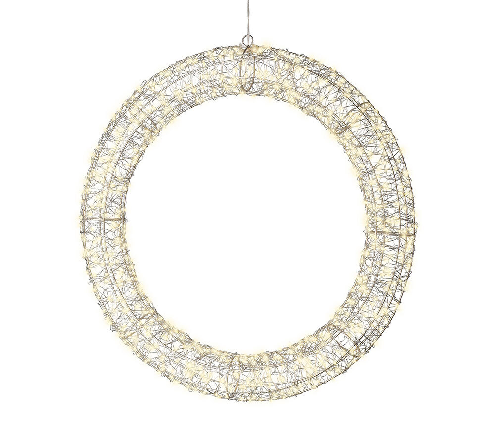 - Der Kranz ist aus silberfarbenem Metall gefertigt und mit einer Micro-LED Lichterkette umwickelt.