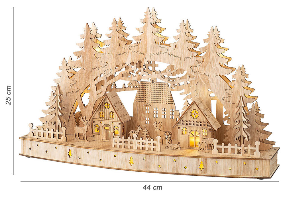 - Aus naturbelassenem Holz gefertigt, zeigt der Schwibbogen ein idyllisches Weihnachtsdorf mit detailreichen Häusern, Tannen und Rentieren.