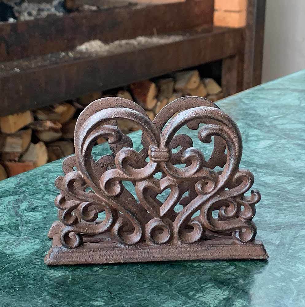 Dieser wunderschöne Serviettenhalter aus schwerem Gusseisen ist ein wunderschöner Blickfang auf Tisch und Tafel! Auch als Briefhalter auf dem Schreibtisch ein schöner Hingucker!