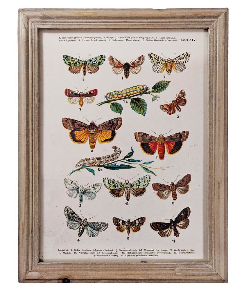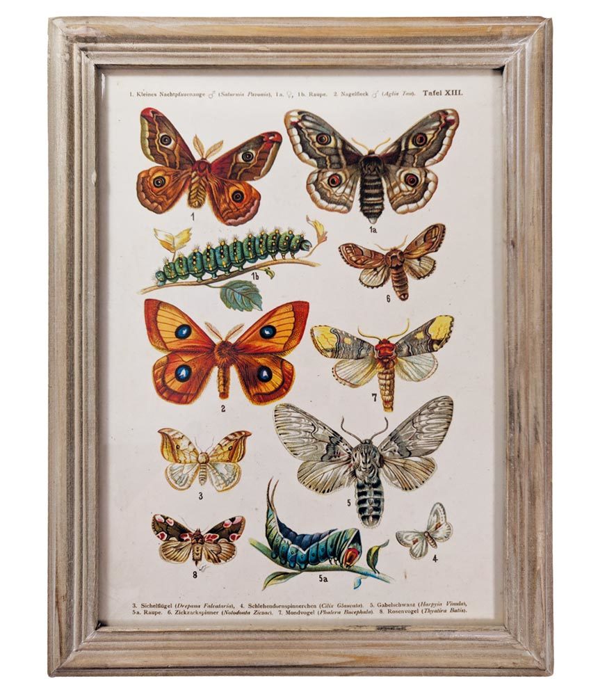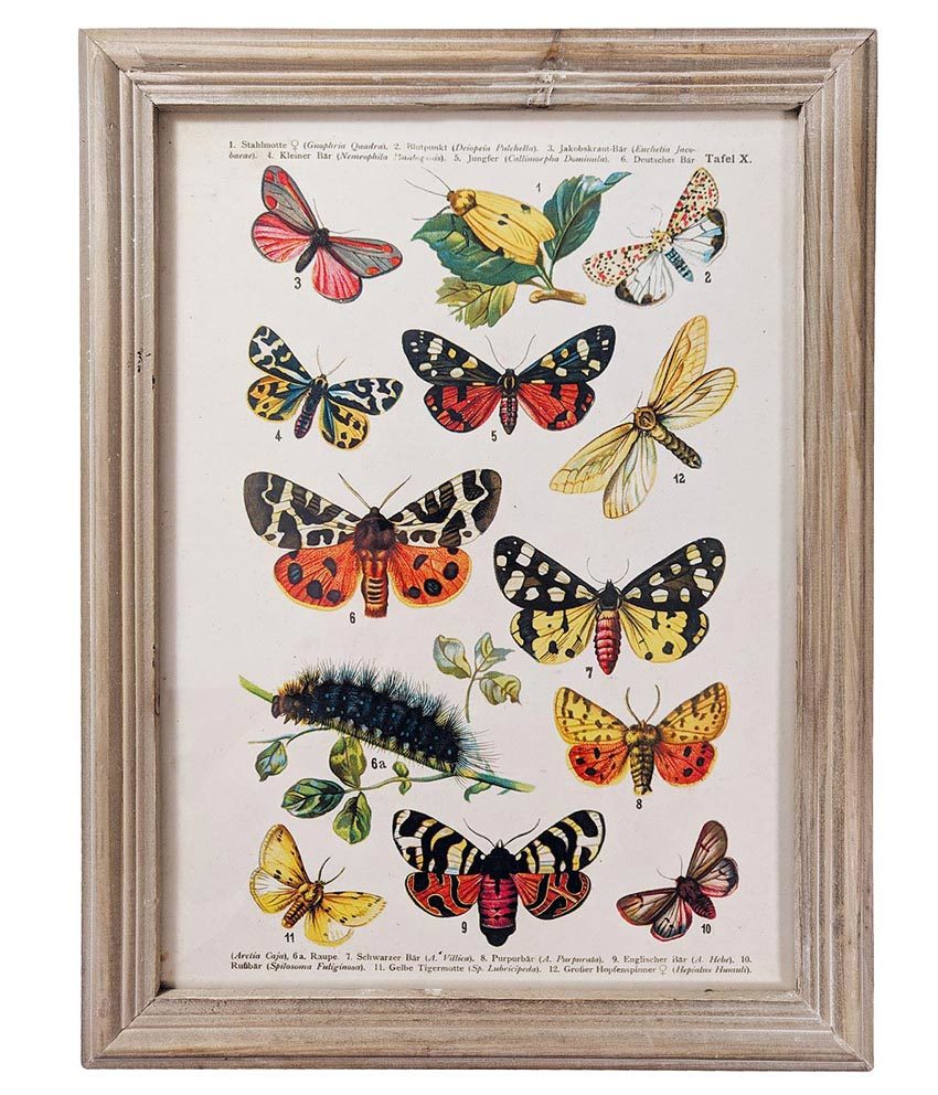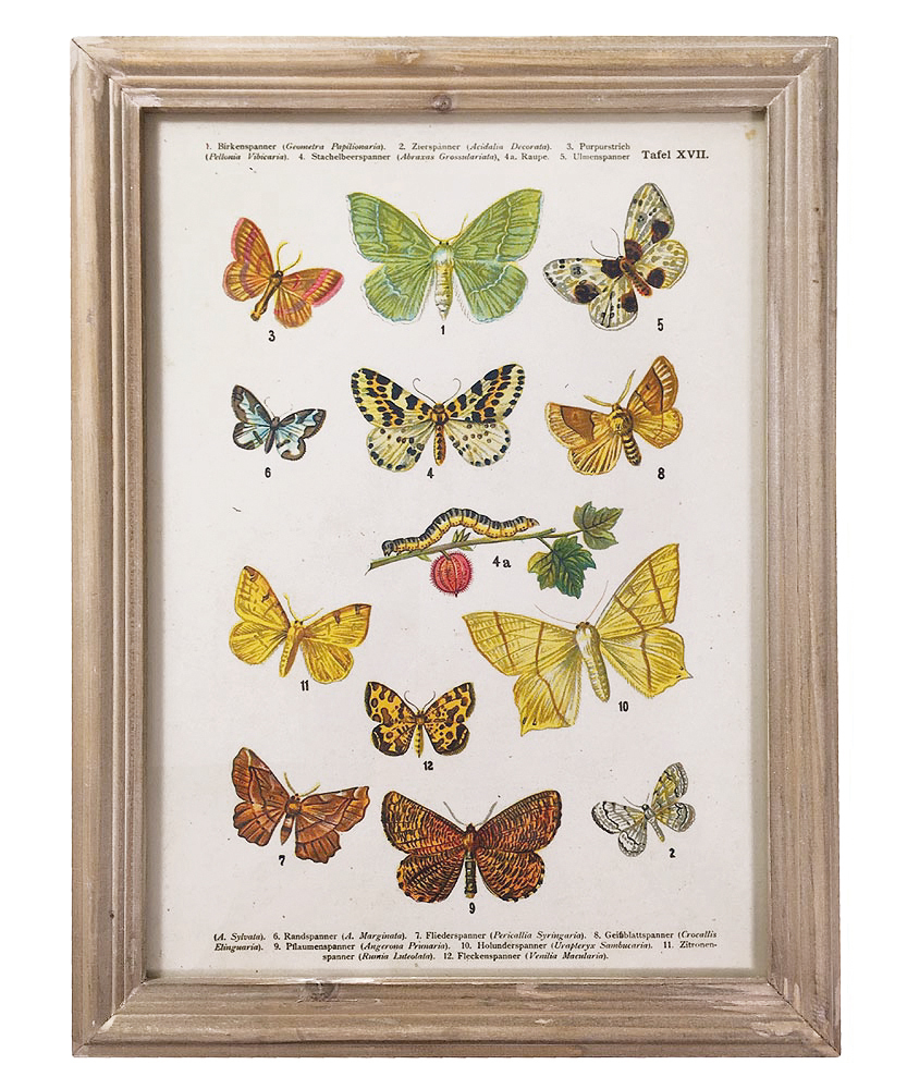 Die 4 Schmetterlings Bilder mit dem Naturholzrahmen sind ein guter Blickfang an der Wand. Das Aussehen und die Form der Bilder erinnert an alte Schmetterlingsbilder aus dem Biologie Untericht.